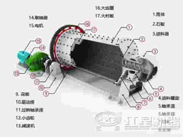 球磨机由给料部、出料部、回转部、传动部(减速机,小传动齿轮,电机,电控)等主要部分组成。球磨机中空轴采用铸钢件,内衬可拆换,回转大齿轮采用铸件滚齿加工,球磨机筒体内镶有耐磨衬板,具有良好的耐磨性。本机运转平稳,工作可靠。
